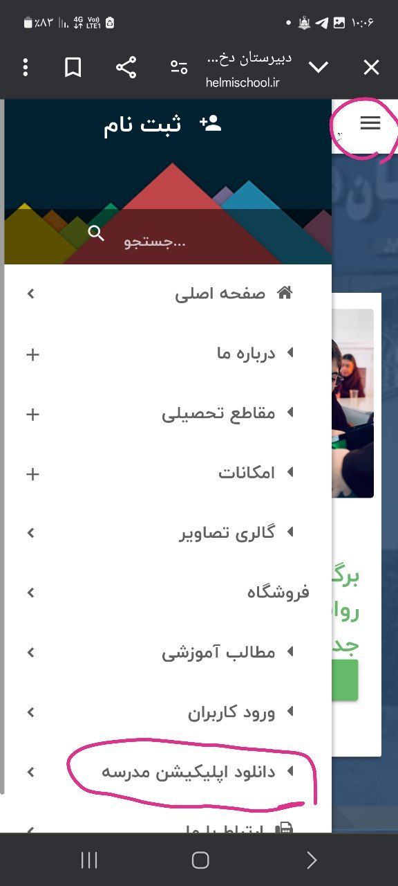 - از منوی باز شده، گزینهی دانلود اپلیکیشن مدرسه را انتخاب کنید.